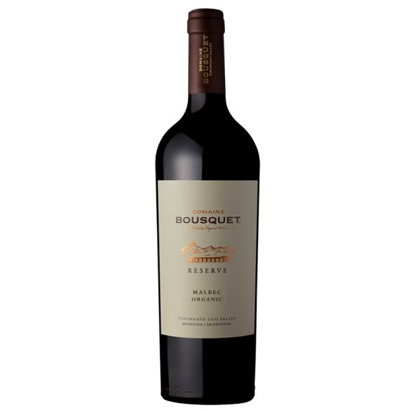 Domaine Bousquet Reserve Malbec Orgánico es un vino tinto elaborado en el Valle de Uco, Mendoza, a partir de viñedos certificados orgánicos situados en altitud. Elaborado 100% con Malbec, combina la intensidad varietal con la frescura que aportan las noches frías andinas. Parte del vino realiza crianza en barricas de roble francés, aportando complejidad y elegancia. Presenta aromas de mora, ciruela madura y sutiles notas de cacao y especias. En boca es estructurado y equilibrado, con taninos redondos y un final largo que refleja el carácter puro del Malbec de montaña.